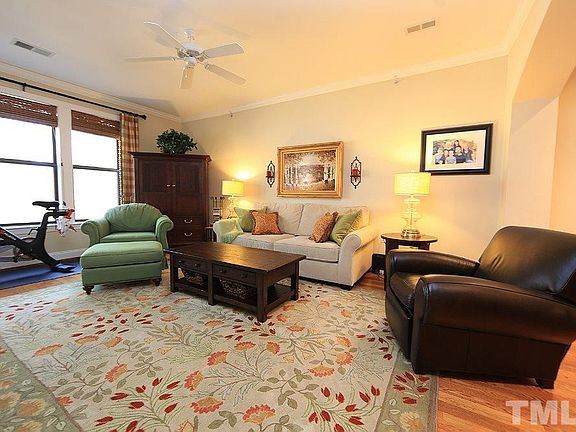 Upscale luxury living in this 3rd floor unit w/elevator access and building security. Walk to nearby restaurants! Site finished hardwood floors * Fireplace flanked w/built-ins * Very private w/wooded views * covered balcony/porch * kitchen w/granite counters, s.s. appliances, breakfast bar *large living/dining combination * MBR w/custom closet design and luxury bath w/soaking tub plus tiled shower. Amenities include clubhouse, pool, gym, meeting rooms. Carefree living in the heart of south Durham.