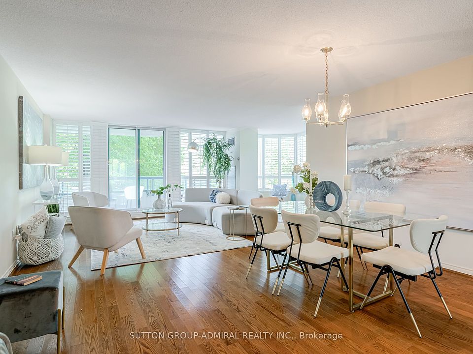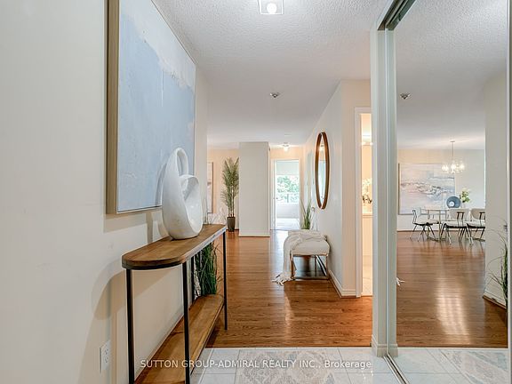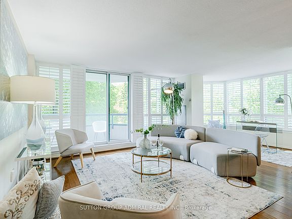 A RARE GEM in the heart of Thornhill at The Palladium! This expansive corner suite, spanning over 1,500 square feet is a one-of-a-kind opportunity. The thoughtfully designed living space is bathed in natural light, pouring in from three breathtaking direction: south, west, and north creating a warm and inviting atmosphere. Walk into a gourmet eat-in kitchen, perfect for culinary enthusiasts. Step out onto one of two private balconies to enjoy serene tree lined views. The primary bedroom is a true retreat, boasting a 5 piece ensuite with dual sinks, a deep soaker tub, and a separate shower. The second bedroom, equally inviting, opens to its own balcony and has a stylish four-piece bathroom steps away. A spacious foyer closet and a dedicated laundry area add practicality to this unit. Includes one underground parking spot. Maintenance fees conveniently include all utilities + Cable. Just steps away, you will find vibrant dining, top-tier schools, and seamless public transit. Indulge in exclusive amenities, including a 24/7 concierge, an outdoor pool, fitness center & party/meeting room. DO NOT let this extraordinary opportunity pass you by-schedule your private tour today!