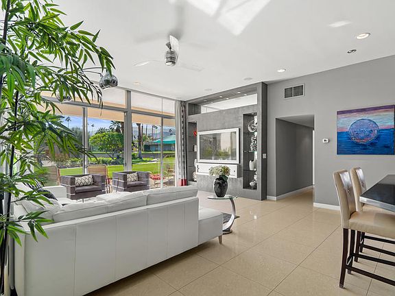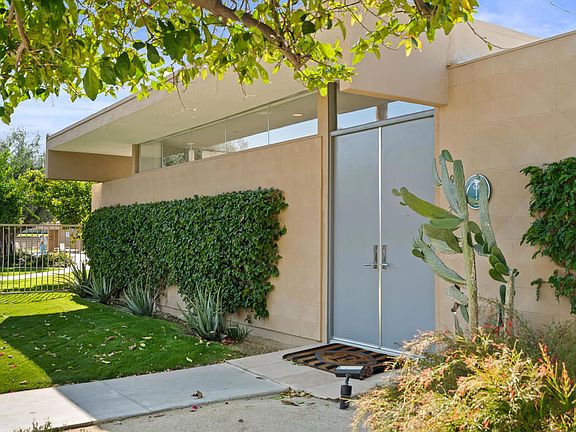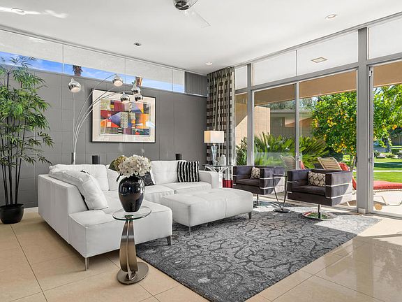 Remodeled 3 bedroom / 2 bathroom Sandpiper unit showcasing William Krisel's classic mid-century design while offering a bold and contemporary feel. This condo features tile flooring throughout along with distinct architectural elements such as concrete block walls, high ceilings, and clerestory windows, complemented by sweeping southwestern views of the greenbelt and mountains.The updated kitchen features modern, high-gloss cabinets, sleek quartz countertops, and recessed lighting, seamlessly integrating into the living area while offering ample storage and counter space. The expanded dining area opens to a sizable, private courtyard with mountain vistas and an outdoor laundry closet. The luxurious master suite is separated from the guest quarters for enhanced privacy and includes a bath with updated cabinets, quartz countertops, a walk-in shower, double vanities, and overlooks the courtyard. The guest bedroom, features modern, white, high-gloss built-in storage cabinets, and serves as a versatile space that can be used as an office or den. The spacious 3rd bedroom offers a comfortable retreat for guests with courtyard access. The property is within a short distance to El Paseo's premier restaurants and shops, as well as nearby hiking trails. The unit is being sold fully furnished and includes a 1-car detached garage and is located in the historically designated section of Sandpiper. This HOA also allows 1 week minimum rentals.