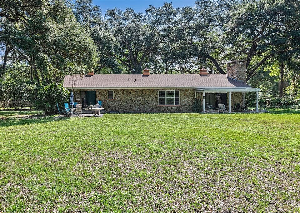 Nestled on a beautiful near 3-acre lot in Zephyrhills, FL, this stunning property is a sight to behold. The tall oaks that canopy the lot lend a picturesque and tranquil Florida-style atmosphere, offering the perfect country feel with all the benefits of city living. Boasting an open floor plan, a wood-burning fireplace, and stunning custom hand-made mahogany kitchen cabinets with a center island and bar, this home is perfect for those who love to entertain or enjoy comfortable living. The kitchen is equipped with 2 built-in ovens and granite countertops, making meal preparation a breeze. The master bedroom is spacious and comes complete with sliding doors to an open patio, a walk-in closet, and dual sinks in the master bath. Two additional open patios, one off the living room and the other off the kitchen area, offer ample space for outdoor relaxation and entertainment. Don't miss the chance to make this stunning property your own!