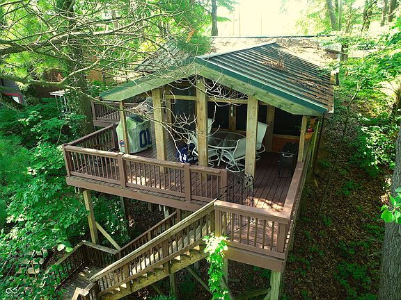 The BEST OF BOTH WORLDS! Log Cabin in the woods with privacy galore PLUS oversized parti 28'x21' parti deck w/double boat lift on 90' waterfront on beautiful Cordry Lake. The home is a "Panabode Cedar Log" structure with 2 bedrooms, 1 bath, and kitchen/dining combo. Step out to the14'x13' screened porch and then...step out to the 18'x13' deck in the tree tops overlooking the property and waterfront. Want to play on the water?...steps and path through the woods to the waterfront amenities.....a 40'x14' deck area w/electricity, storage unit and changing room with refrigerator....a few more steps to the double sized 28'x21' parti deck above double electric boat lifts. The home is offered with most furnishings for new owners ready to enjoy. New metal roof in 2016. Main paved road location adds to the convenience or access. The property of 1.5 lots offers 90' waterfrontage and possible room for the expansion of the home. Walk across the street to entrance to the hiking trails that meander through the woods to Sweetwater Beach. Cordry Lake is located in northern Brown County and offers crystal clear water for property owners to enjoy boating, water sports, fishing, swimming, and the beauty of the hills of Brown County. *Electric Duffy pleasure boat is included in the advertised purchase price....use Personal Property form. * (Cordry Lake may be temporarily lowered 2 feet in the October of 2024 for spillway repair)