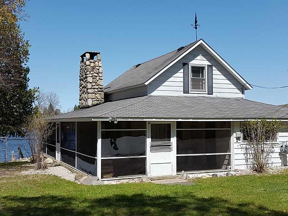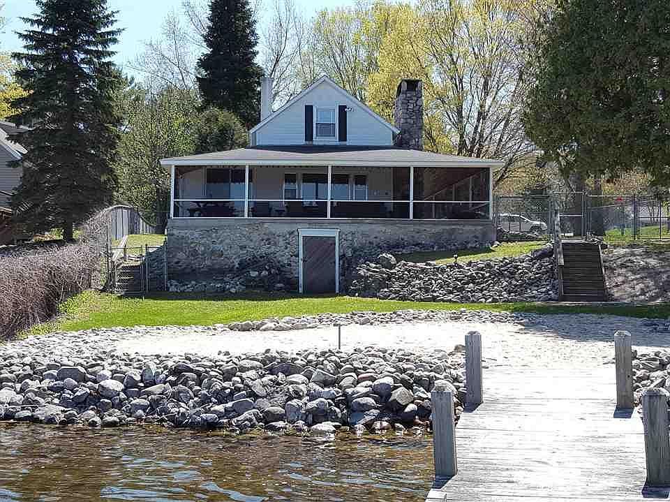 CLAM LAKE WITH A SANDY BEACH! This house has it all! The entire lower chain of lakes are accessible from this charming waterfront cottage and your own private permanent dock! Cozy up in front of the fieldstone fireplace or enjoy the serenity of the water lapping at the shoreline from the covered, screened in wrap around porch. New furnace with Natural Gas just installed April 2016! Great attention to detail in this home. Fenced in yard with gate. Garage could be converted to rec room or guest quarters.