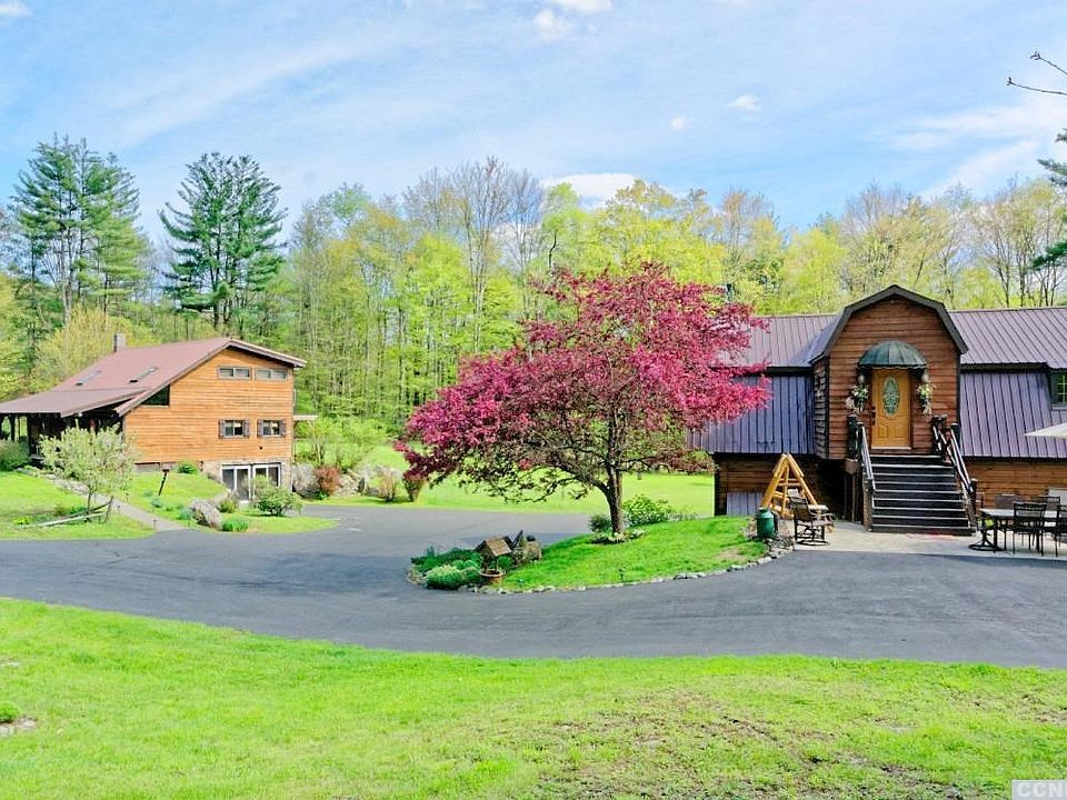 Stunning Country Compound. Gorgeous Post & Beam Home. PLUS 1450sf Guest House over a 6-car heated garage (covered carport too). Let your imagination take over! This versatile property could be the home of your dreams. Handsome post& beam construction & open flr plans in both. Every room boasts dramatic soaring ceilings, handhewn beams & exquisite locally-grown/milled hardwd flrs. MAIN HOUSE: 3Bd/2Ba. 3 levels includes large lower Game Rm & Bar w double glass doors to driveway. Perfect for entertaining family & friends. Dramatic Great Rm. Open loft. Large Country Kitch. Big counterbar. Dining Rm opens to back deck. 1st-flr Bdrm & full bath. Upstairs MBdrm, 3rd Bdrm & full bth. GUEST HOUSE: Stunning wood-beamed interior. Bay windows. Granite Kitch. Large MSuite w granite EnSuite. Private Sitting Rm. Beautiful grounds. Spacious lawns. Big covered front deck. Lovely stone water pond. Relax to water cascading into the coy pond. Abv-grnd pool. Htd garages equipped w compressor. Ex Condition.