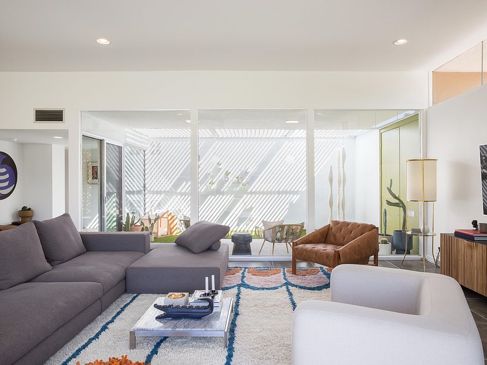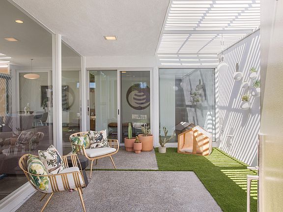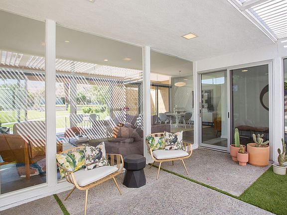 **Accepting backup offers!** This impeccably re-designed mid-century Sandpiper home is an architectural masterpiece featuring the highly sought after atrium floor plan and clerestory windows, creating a naturally light and bright space complemented by high-end custom finishes. Incredible San Jacinto Mountain views are the perfect backdrop to the Southern facing patio and walls of floor to ceiling sliders that open seamlessly to create the perfect indoor/outdoor desert experience. You will appreciate the meticulous details in the design throughout, including custom built bleached walnut cabinets, Fisher & Paykel appliances, Axor faucets, large soaking tub and modern large- scale floor tiles creating an elevated modern look within the timeless mid-century modern architecture. The convenience of having your garage close by while also having the option to enjoy an urban lifestyle with the nearby Whole Foods, world class El Paseo shopping and restaurants, hiking/biking trails and tennis is what makes Sandpiper a truly special community to own in! *current furnishings not as photographed*