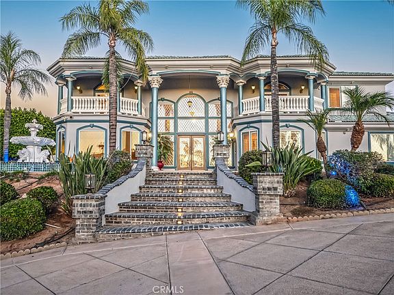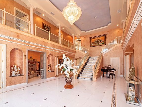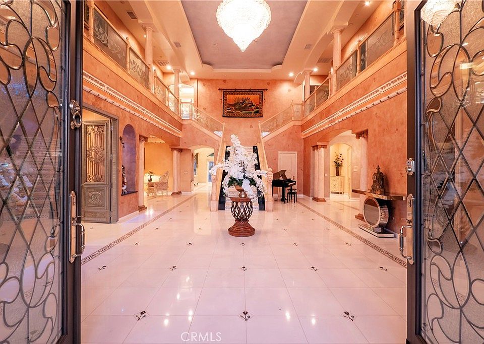 Guests will be captivated from the moment they arrive. Walking past the welcoming sculpture, they'll enter through double beveled glass doors into a dramatic two-story foyer that takes center stage. Elegant mother-of-pearl inlay adorns the marble flooring, while rope lighting illuminates the soaring space. Surrounding this stunning foyer, discover a music alcove, two versatile bedrooms, a gracious living room, a formal dining room, and a bonus room perfect as library, wine cellar, home office, or bar tailored to your lifestyle. The second floor offers five spacious bedrooms, each thoughtfully positioned for privacy and a designed theater room —that can convert easily to an additional bedroom. The crowning jewel is the opulent primary suite; complete with a private balcony, cozy fireplace, reading nook, luxurious 14k gold bathroom fixtures, makeup vanity, dual sinks, and a walk-in closet with built-in dressers.