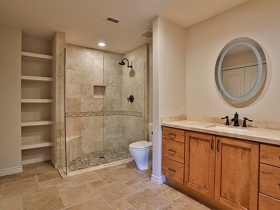 - Bathroom Features: Shower & Tub, Remodeled, Travertine, Tile Shower