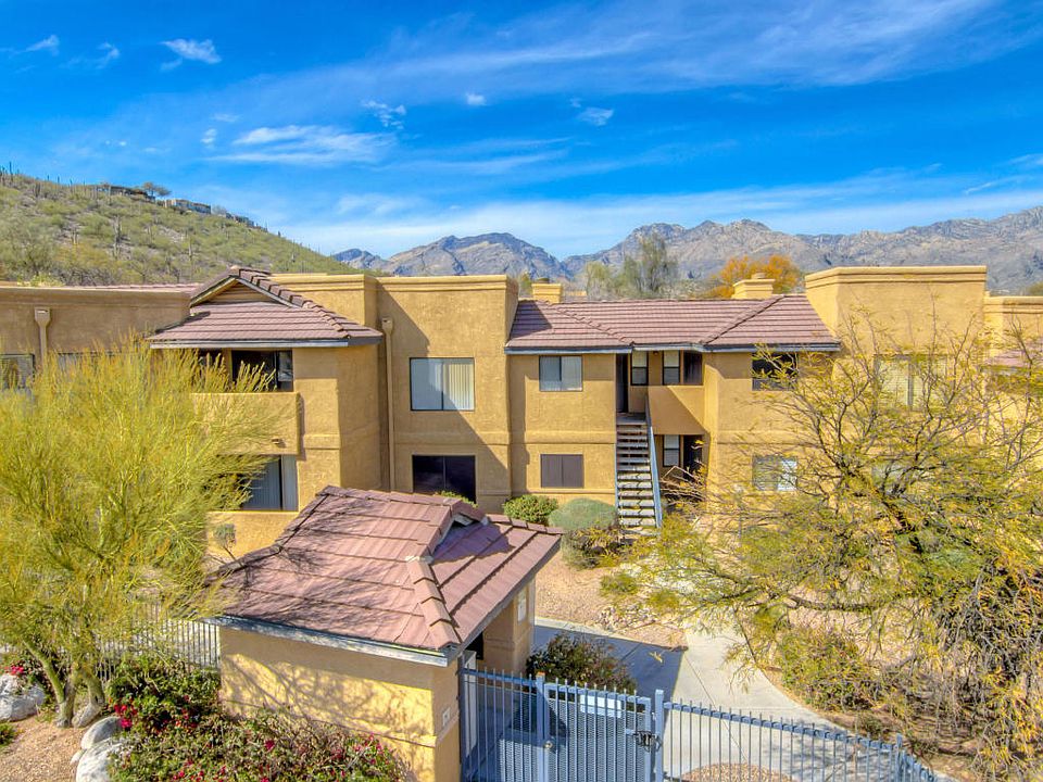 Top Floor Condo in the Beautiful Sabino Canyon Area! Condo features spacious Family Room, cozy fireplace with tile surround, custom interior paint colors, neutral carpet, ceiling fans throughout, interior laundry, gated community, and much more. Guest Bedroom has fantastic foothill views and adjacent full hall bathroom. Spacious Kitchen with plenty of cabinets and all coordinated appliances included. Master Suite has views overlooking the pool area, walk-in closet, and full bathroom. Covered back balcony with pool area views and storage closet. Community pool/spa and exercise room. Great location near restaurants, shopping, and Sabino Canyon Recreation Area.