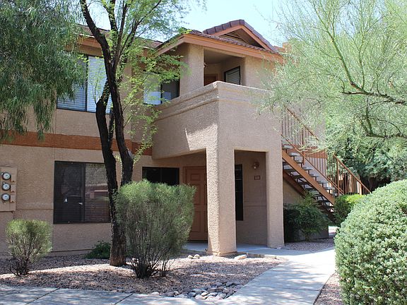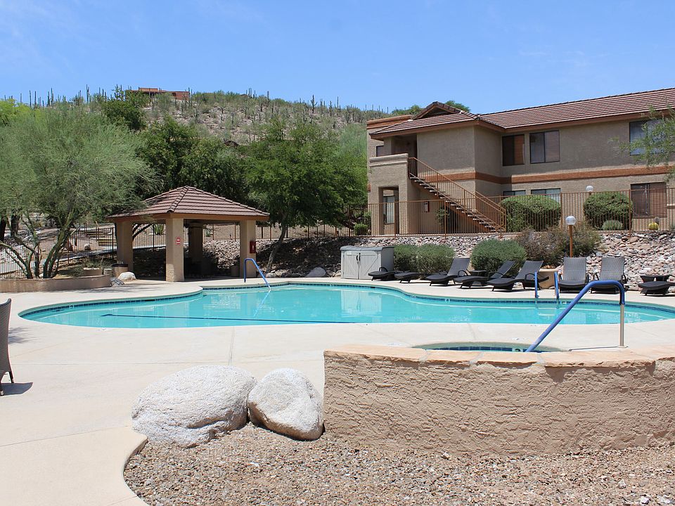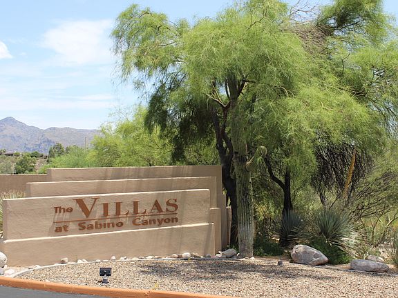 A fully-updated, ground-floor condo with beautiful views located in the Villas at Sabino Canyon! Wonderful corner unit next to a lush common area. Enjoy the heated community pool & spa all year round. Lots of natural light throughout the open floor plan. Great kitchen with beautiful cabinetry, stainless appliances, and granite counters. Fully-updated bathrooms. Modern, attractive ceramic tile throughout the living areas and both bathrooms. Master bedroom has nice-sized walk-in closet. Covered patio with storage room that is accessible from the master bedroom or the great room. Property comes with a designated covered parking space. All furnishings inside the unit can be purchased on a separate bill of sale. Move right in and immediately enjoy all that this community has to offer!