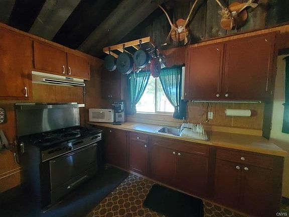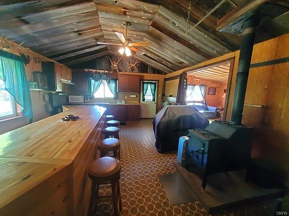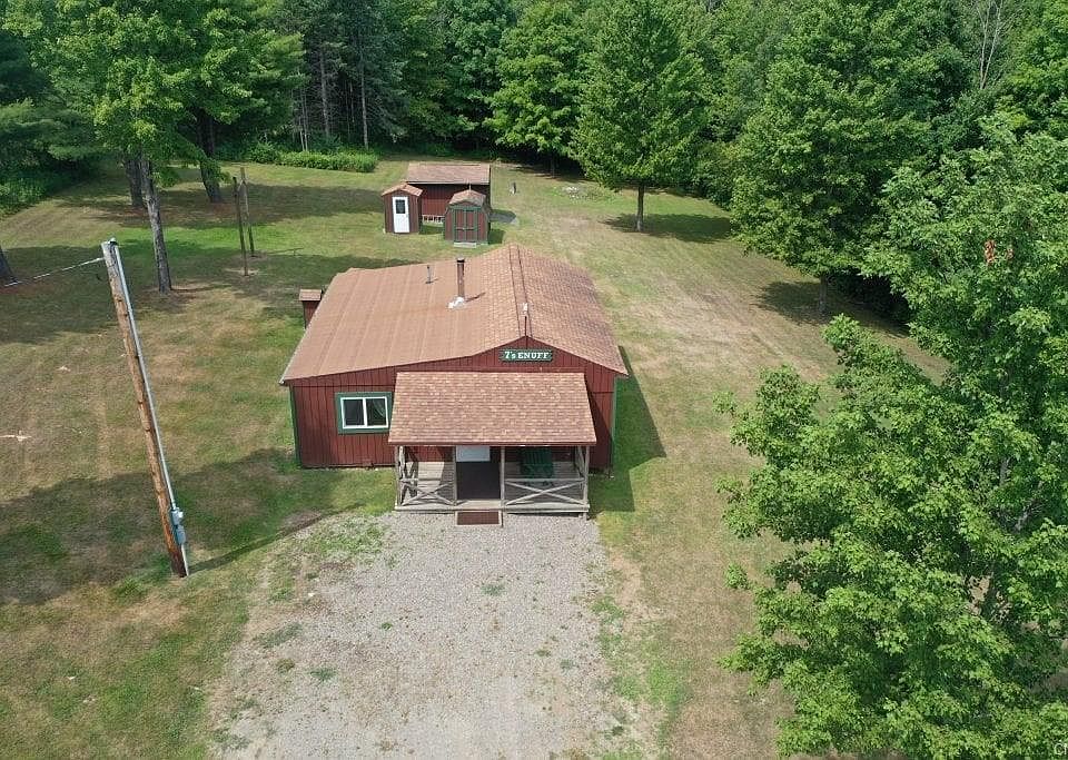 This hunting cabin and weekend retreat near state land is waiting for a new owner. Located in the Finger Lakes Region of Steuben County, this cabin has been enjoyed by a group of friends for several decades. Walking onto the property you can instantly see the pride in ownership and feel the memories made in this comfortable cabin. The property includes two porches, two sheds, an outhouse, and skinning pole. After a day of successful hunting, from the front porch enter the kitchen which features a large custom bar, commercial grade stove and wood stove. Off the kitchen is a lounging area with a dining table, couches and a propane wall heater. The bunk room includes 8 beds and has a room attached for changing and storage. In the back of the cabin is an area with running water to wash up and shower. On the cabin side of the road, there is 4+ acres with a large lawn and hardwoods. Across the road is 30+ acres consisting primarily of timberland with a small 3 acre meadow along the northern property line. Existing maintained trails wander throughout the woods that consist primarily of large oak trees and areas of red and white pine.