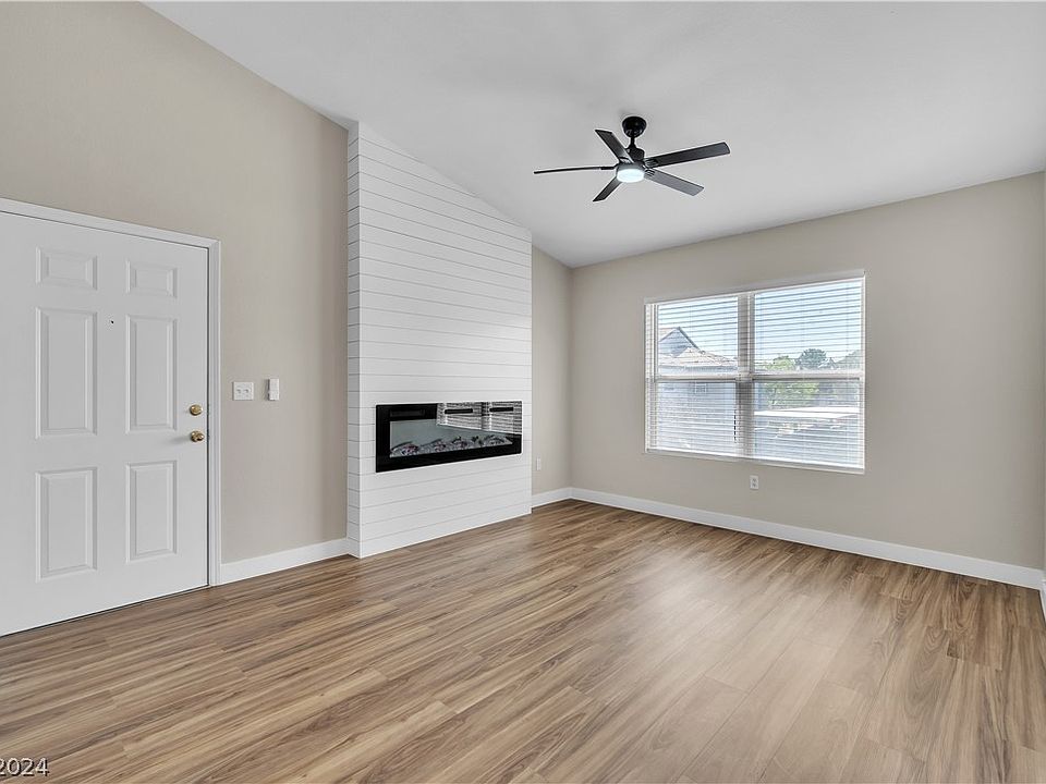 Discover the convenience & comfort of this beautiful 2-bed condo located within 10 minutes of the airport and the south end of the Strip. Enjoy easy access to shopping, retail, restaurants, the 215 freeway, new Durango Resort & South Summerlin. With vaulted ceilings in the living room & primary beds, this condo is bathed in natural light, creating an inviting & spacious atmosphere. Featuring all new paint, baseboard, custom fireplace, custom lighting package, wood laminate flooring, custom showers, new toilets, plumbing fixtures, this condo is a true gem. The kitchen is equipped with a breakfast bar and pantry, providing ample storage and convenience. As well as all new shaker cabinets, quartz counters, & stainless steel stove, dishwasher, & microwave. Situated in a gated community offers privacy & tranquility - amenities include basketball courts, a fitness center, pool, spa, and clubhouse. You don't want to miss this one!