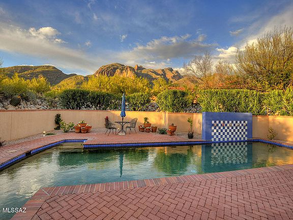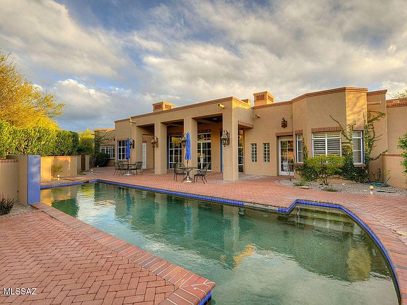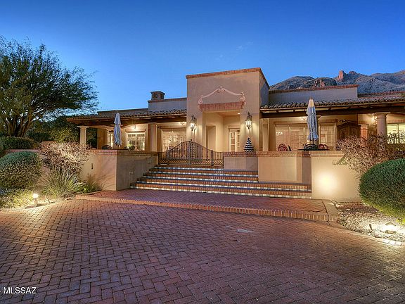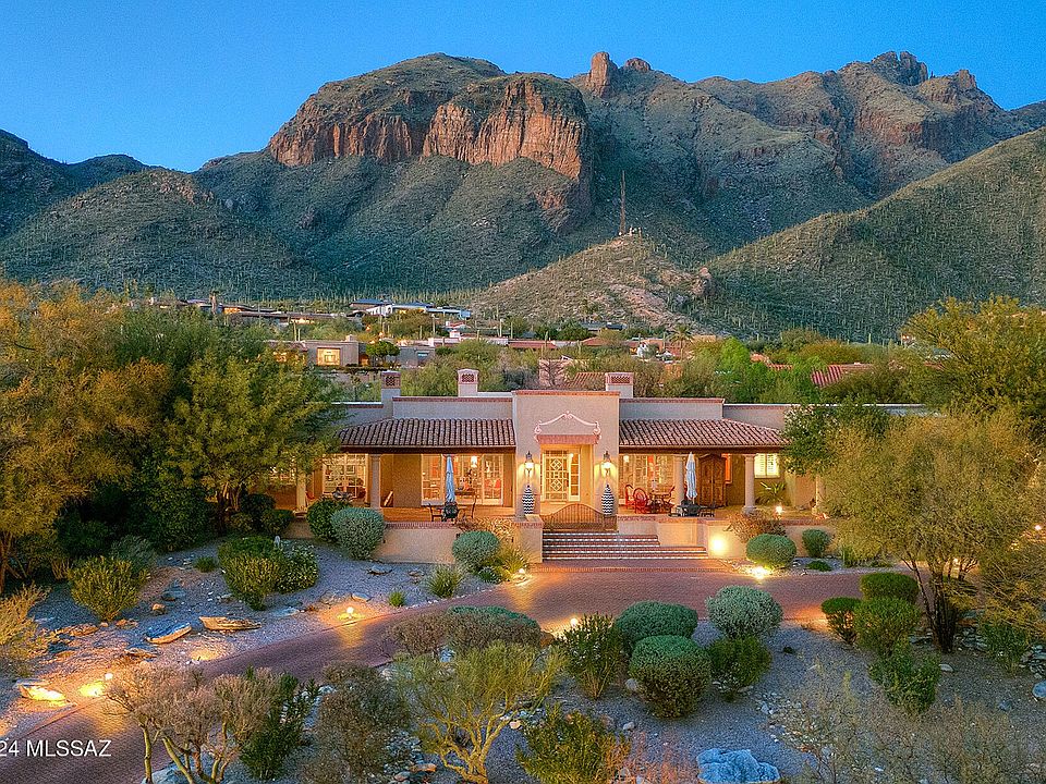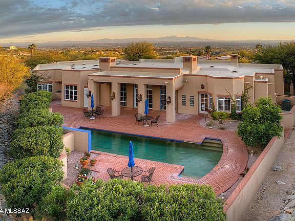 Welcome to this exquisite home, crafted by renowned La Quinta builders and designed by the esteemed Mike Franks, offering a perfect blend of old-world charm and modern conveniences. Situated to capture the breathtaking beauty of Tucson, with city lights greeting you from the front and Catalina Mountain views embracing you from the back, this residence promises a lifestyle of serenity & luxury. As you step onto the large welcoming patio and enter the home, you're enveloped by the warmth of the scored concrete flooring that flows seamlessly throughout. The open flow of the living, dining, and office space creates an expansive atmosphere, ideal for entertaining guests or simply enjoying quiet evenings at home. Step into a realm of culinary delight, where Dacor double ovens stand ready to turn your culinary aspirations into reality. Mosaic tile counters, meticulously crafted with precision, elevate the aesthetic charm while offering durability and ease of maintenance. Each detail, from the custom paint finishes to the carefully chosen fixtures, speaks to a commitment to excellence and luxury. Warm emanates from the flickering flames of the fireplace and a generous size island takes center stage, providing ample space for meal preparation, casual dining & lively conversations. The kitchen is also equipped with a Sub-Zero refrigerator, dedicated desk area and wet bar where you can mix up those speciality drinks. Walls of windows in the living areas frame the panoramic views, while wood plank ceilings with wood beams add a touch of rustic elegance. Additional highlights include a wine cellar, ensuite guest rooms, skylights, coved ceilings and wide hallways enhance the home's grandeur. French doors throughout open up to private patio spaces, inviting the outdoors in and providing seamless transitions between spaces. The spacious primary suite beckons with double closets, a cozy fireplace, and a luxurious bathroom featuring a large tub & separate shower. Step outside to discover the inviting backyard oasis, complete with a pool and lush landscaping, perfect for enjoying the sunny days and cool evenings Tucson has to offer. Featured in Tucson Lifestyle Magazine, this home is a true testament to refined living. With high ceilings, a circular drive, and plenty of parking, this residence offers both elegance and practicality.