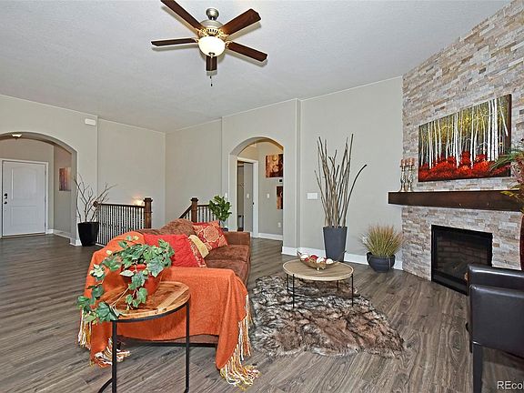 Welcome Home to this Gorgeous Stucco and Stone Rancher on a quiet street in Indigo Ranch at Stetson Ridge! Open Concept Living at its best with stunning hardwood floors and 10' ceilings throughout main level! Walkout great room has gas fireplace and opens to separate dining and a gourmet kitchen with quartz counter and glass tile backsplash, walk-in pantry, Island with counter seating to fit 6 comfortably, and stainless appliances including gas stove top. Large Main Level Master with new carpet, attached walk-in closet, and 5pc bath with large soaking tub, walk-in shower, quartz counters and glass tile backsplash and accents. 2nd main level bedroom off entry and full bath has double closets and extended window seat. Enormous family room downstairs is plumbed for a wet bar. Two more large bedrooms downstairs share a jack n jill full bath with double sinks and closet. 2nd full bath and enormous storage room that could accommodate another future bedroom. Main level laundry room off three car garage. Fenced backyard is beautifully landscaped with different entertaining areas including covered patio and giant playset! This home is a dream! Come see! Inclusions:Refrigerator, microwave oven, gas range, oven, disposal, dishwasher, central air conditioning, automatic sprinkler system, security system
