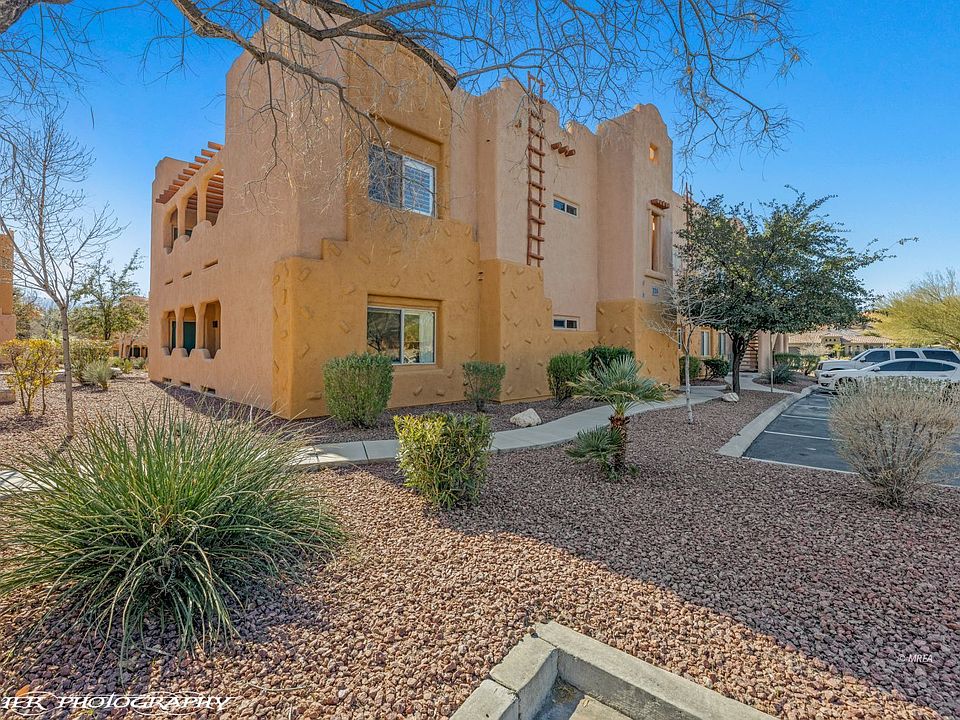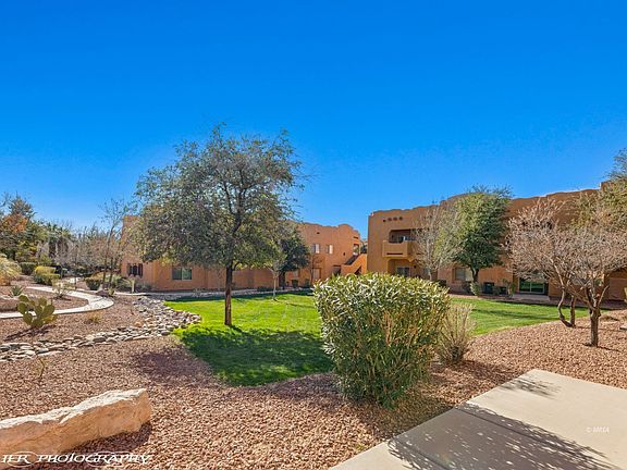 This spacious main level condo is located in Enchantment, a quaint community north of I-15 surrounded by the Oasis Golf Course. The condo is tucked away at the north end of the community and surrounded by soaring Palm trees, lush green common area, gorgeous desert scape and cascading waterfall. The setting is beautiful and offers ample privacy and parking. The floor plan is open and thoughtfully designed with generous room sizes. The two main suites are on opposite sides of the home with bathrooms, walk-in closets and patio access. The great room and breakfast nook have attractive flooring and two sliding glass doors to the back and side covered patios. The outdoor walk-in closet is ideal for storage. The washer and dryer are included and are conveniently located inside the condo. The community swimming pool and hot tub are only a short walk away. Home ownership in Enchantment allows access to the Mesquite Vistas (Master Planned Community) swimming pool, hot tub, fitness facility and tennis courts.
