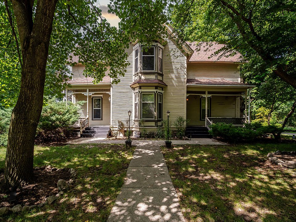 Experience the timeless charm of this historic two-story Folk Victorian nestled on 3.3 acres in the heart of Belding. This unique property offers 4 spacious bedrooms and a large full bathroom with an attached laundry area. You'll be captivated by the original woodwork throughout the home, which includes a charming pocket door in the formal dining room, and a hidden entrance to the main bedroom, adding to its allure. Outside, you'll find a serene, park-like setting with mature trees, garden beds, and a cement patio perfect for relaxing or entertaining. The property also boasts a 32x40 three-stall detached garage with an insulated and heated upstairs loft—ideal for a game room or guest quarters. Plus, two storage sheds and 50amp EVSE hookup for electric car charging offering convenience.