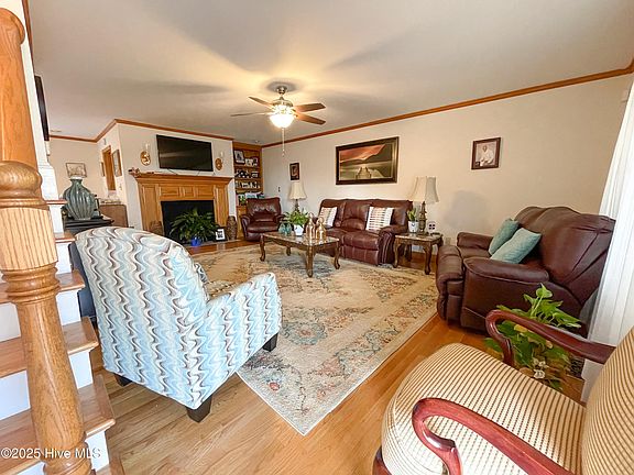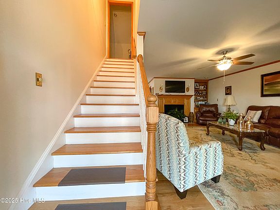 Step inside to discover a warm and inviting interior with hardwood floors throughout. The main entrance leads you to a beautiful staircase, with a versatile bedroom/office immediately to the left. The spacious living room is centered around a cozy gas fireplace, creating a welcoming atmosphere.