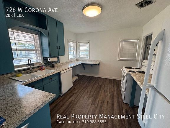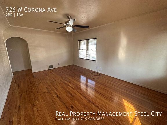 his property includes a $100 monthly solar panel charge. Welcome to 726 W Corona Ave, a beautifully updated 2-bedroom, 1-bath ranch-style home offering 832 sq ft of inviting living space in a quiet Pueblo neighborhood. Featuring hardwood floors, ceiling fans, and central air, this home provides both comfort and efficiency. The kitchen is equipped with a refrigerator, dishwasher, and ample space for dining. Outside, enjoy a spacious fenced backyard, attached 1-car garage, carport, and additional off-street parking. Built in 1950 on a 0.14-acre lot, this home also benefits from a fully paid-off solar system that keeps utility costs low. Conveniently located near downtown and local amenities, this charming property is a perfect blend of character and practicality. None