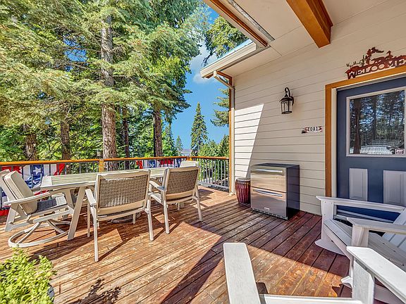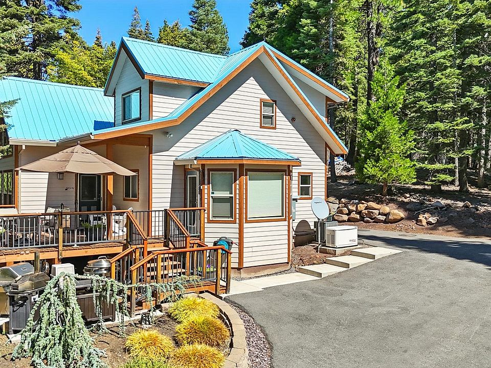 Charming Lake View Cabin in Lake Almanor Country Club! This newer lake-view cabin offers the perfect blend of mountain charm and modern comfort! Step inside to a warm and inviting living room featuring wood-accented laminate flooring, a stunning floor-to-ceiling stone hearth with natural wood-burning fireplace, vaulted wood ceilings with exposed beams, and a wall of windows showcasing natural light and a peek of the lake. The thoughtfully designed kitchen boasts slab granite countertops, a central prep island, rich cabinetry, modern appliances, and a cozy dining area highlighted by pine ceilings. The main-level primary suite includes wood accents, a spa-like tiled bathroom with dual-head shower, and the convenience of in-room laundry. Upstairs, two additional bedrooms and a versatile loft offer space for guests, a game room, or a home office. Outdoor living is a true delight! Relax or entertain on the expansive deck while soaking in sunset views over the lake. Enjoy the built-in BBQ area, a fire pit for s’mores, and a heated outdoor pantry for year-round use. A large detached shed provides ample storage for your golf cart and lake toys, and there is plenty of parking on the large asphalt area adjacent to the house! Additional features include: central A/C, durable hardboard siding, and a 14KW auto-transfer generator in case of a power outage. Nestled on a quiet cul-de-sac in the desirable Lake Almanor Country Club, this home is immaculate and truly move-in ready—the complete package for mountain and lake living!