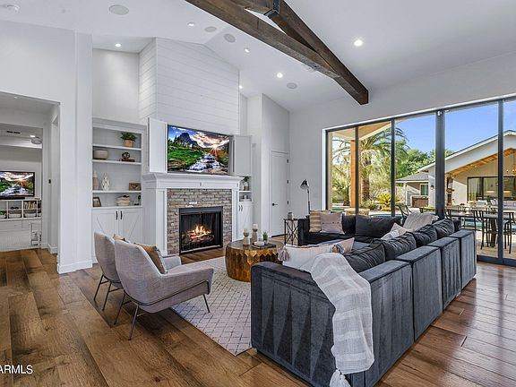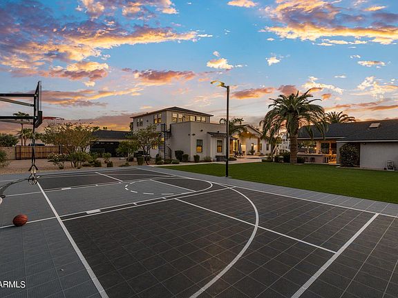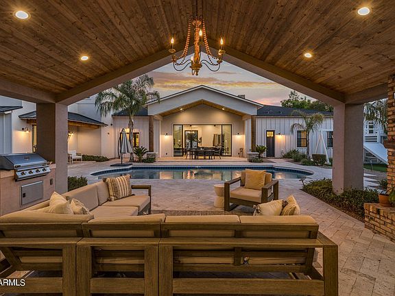 Experience ultimate luxury in the heart of Scottsdale. This modern farmhouse seamlessly blends contemporary elegance with warm wood & natural elements like hickory wood floors & artistic touches throughout. The great room flows into the gourmet kitchen with infinity doors opening to the backyard. Across the patio and pool, a guest house awaits, boasting a full kitchen, two bedrooms, full bath, & laundry room. The wall of windows opens up to a ramada with a fireplace and outdoor kitchen, creating the perfect space to relax or entertain. The resort-style backyard also features turf & a new pickleball sport court. The lush landscape adds to the picturesque charm of the setting. The luxurious primary suite is complete with his and hers closets and the master bath is a sanctuary of relaxation. A separate wing of the house offers a versatile teen or flex room, surrounded by three designed bedrooms. Discover more surprises including a spacious bonus room with a full bath and a walkout view deck, a four-car garage with a convenient drive-through bay, an RV gate & an office. In this modern farmhouse masterpiece, every corner unveils a new layer of perfection, inviting you to bask in its splendor and create a lifetime of cherished moments.