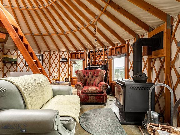 This is the mountain property you've been dreaming of! 7+ acres of privacy, sweeping valley and mountain views, and developed infrastructure. Feels a world away but is only 15 min to downtown Bozeman. A 2007 Colorado Mountain Company yurt was constructed in 2007 w/ all the conveniences for year-round living. Built on slab with radiant heat - boiler runs heat & hot water supply. Loft could serve as a more private sleeping area. Wood stove keeps it cozy. Kitchen features cooktop, refrigerator & microwave. Bath w/ walk in shower. Four of the windows are casements. Skylight at the center that opens. White cedar surround deck looks over meadow & mature trees towards the Bridgers, Gallatin Valley & Tobacco Roots. Gravel access roadway. Yurt site meadow recedes into denser forest. Excellent site to build a luxury home - or enjoy the existing tiny home living aesthetic. NO COVENANTS! Established well, installed 3-bedroom septic, & electric service in place. Don't miss the Matterport VR tour!