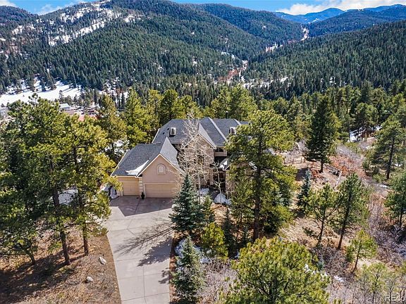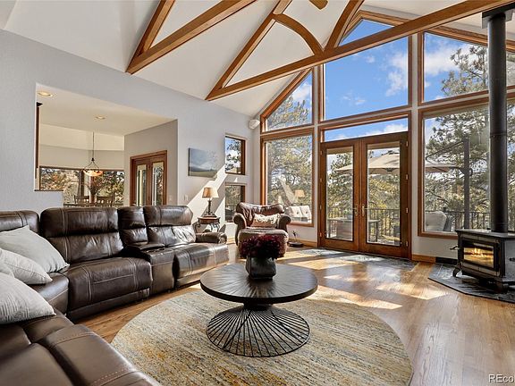 Enjoy the tranquility of the mountain living in this stunning custom-built home designed for comfortable indoor and outdoor living. Enjoy captivating mountain views from every room of the home while the inside delights with soaring ceilings, floor-to-ceiling windows, arched windows, newly finished hardwood floors, and beautiful millwork that highlight this exquisite home. Commissioned by a local artist, a hand-carve eagle from a tree trunk along with a soothing water feature greets you upon entry and provides a warm welcome to a high-level of detailed craftsmanship throughout that awaits inside. The cheerful entry opens to a formal living room and an impressive open dining area. The south-facing family room has sunlight streaming in from a dramatic wall of windows, & overhead wood beams enhance the mountain-vibe feel. Home chefs will love the gourmet kitchen boasting high-end features including a 6-burner Viking gas cooktop, LG InstaView refrigerator, & gorgeous warm wood cabinetry. Main-level primary retreat features all the luxury with a fireplace and newly remodeled one-of-a-kind spa-inspired bath. French doors off the primary bedroom lead to the upper deck for a peaceful view after a long day. A new, modern metal banister leads the way upstairs to two generous-sized bedrooms with new carpeting & private baths. An entertainer’s dream, the walk-out basement impresses with a flowing design that unites a large open area with a wet bar, open theater room, & temperature-controlled wine cellar. 2 more basement bedrooms & nearby bath. Finest mountain living around in this stunning backyard! Sit back and unwind on the large composite deck or journey down to the lower level patio with built-in BBQ, tranquil water feature, spacious dog run, new landscaping, & built-in hot tub with endless miles of views! This home has the best 5-acres of usable land, including a hiking trail for adventures right out your back door! 7 miles to C470, 10 mins to Red rocks, & 25 mins downtown.