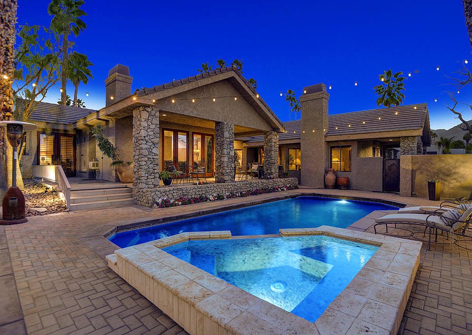 Beautiful furnished home PLUS the ADJACENT LOT a total of approx. 26,000 SqFt of lot space. Located in the desirable area of the Summit in South Palm Desert on a cul de sac w/ spectacular elevated panoramic Mountain views! The home offers 4 spacious bedrooms w Ensuite bathrooms + a powder room, 1 bedroom is set up as an office. The primary bedroom has grape stake wood ceiling, 2 sets of double doors that lead to the pool and a Lg tree lined side yard, an Ensuite w/ dual vanities, bathtub, & steam shower. The entry way leads to the cascading rock Waterfall & Lagoon. A sunken living room w/ fireplace a separate dining room off the kitchen, w/ Dacor gas range, Subzero fridge & opens to family room w/ fireplace, full-service bar, double doors that open to the private pebble tech pool & spa w/ BBQ island + outdoor shower & bathroom steps to the pool. The interior of the house has just been painted throughout; stone floors have been professionally cleaned & sealed. Vaulted ceilings, patios that open to lush landscape lot, artificial turf, multiple palm trees beautiful foliage & the 2nd lot! 3-car garage with approx. 300 SqFt air-conditioned Bonus room w/sliding doors & a roll up garage door. Adjacent vacant lot is included w/ separate road/gate access, a Lg paver parking area, plenty of room for you to get creative or perhaps a guest home. Fabulous location in upper South Palm Desert, the Summit is minutes to El Paseo, fine dining, and plenty of shopping! 2nd Lot APN# 652-043-0