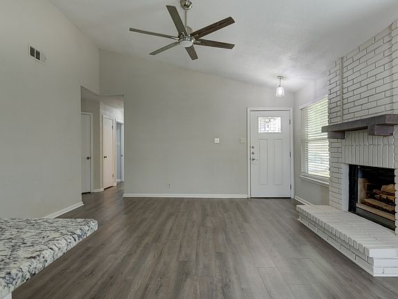 Cozy fireplaceStainless steel appliancesPlank flooringSleek granite countertopsModern kitchenHis and her closetsFenced backyard