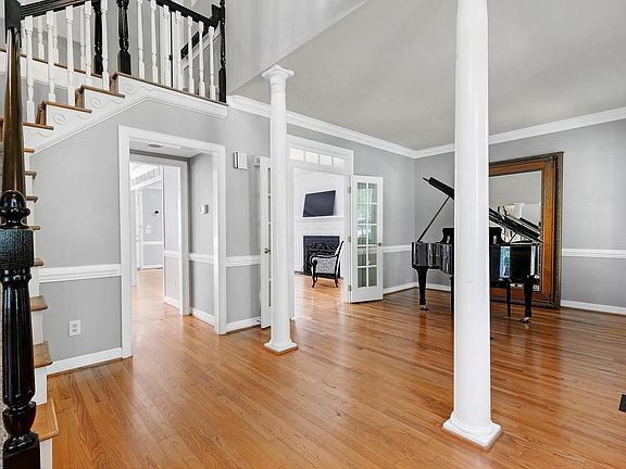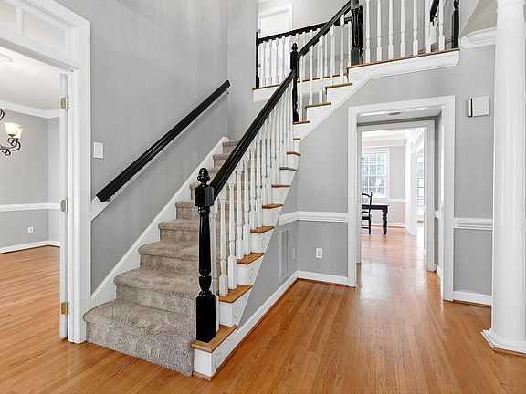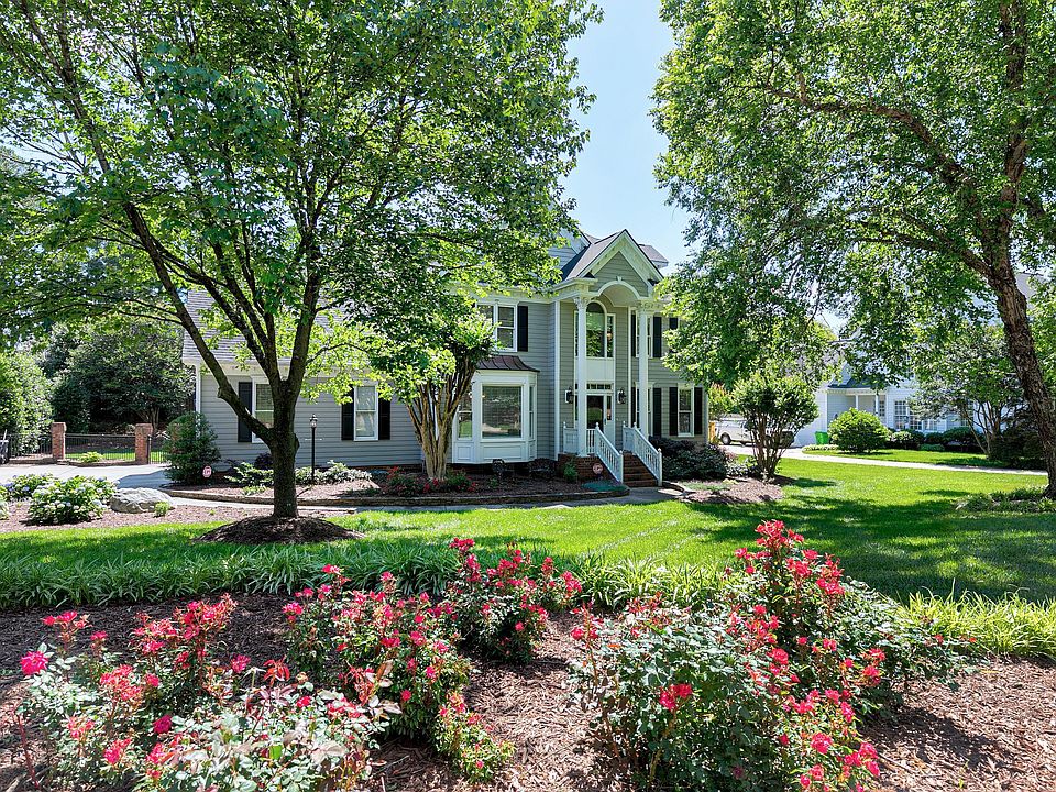 North Raleigh, North Ridge,Golf Course community Transitional Home with elegant entrance columns & extensive woodwork. Open foyer/dual staircase and hardwoods and 9 foot ceilings throughout first floor! Large open kitchen with double ovens open to spacious family room with fireplace. Primary bedroom w/sitting room w/LARGE closet. 3rd floor, private bonus/teen suite/office w/FULL BATH! Screened porch overlooking large deck, outdoor fire pit w/pavers and fenced yard. Yard is professionally landscaped with irrigation and mature trees and bushes.