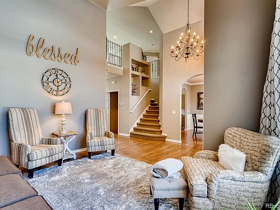 This beautiful home is perfect for entertaining - it features a welcoming entry with vaulted ceilings, beautiful hardwood floors, an open floorplan, tons of windows with natural light and a kitchen with large island and double-ovens. The master suite features a fireplace, his-and-hers walk-in closets and five piece bath with large shower. The huge basement has custom built-ins, a bar, flex-room, bathroom with shower and full-size egress windows. Recent updates include new paint throughout, a brand new furnace, AC and water heater and newly laid 1,000sf backyard patio and pathway. This home is 2 blocks to the community pool & clubhouse featuring tennis courts, playground, basketball, volleyball and covered picnic area. You can walk to local elementary schools and Daniels Park is 1 mile away - great for hiking, biking and exploring. This charming neighborhood also has established annual family traditions like 4th of July parade and holiday party with carriage rides.
