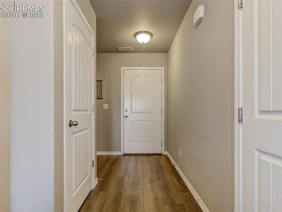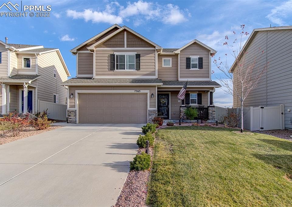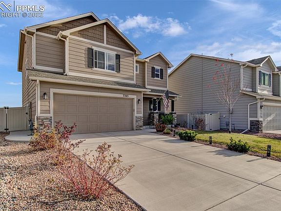 Tucked in on a cult-de-sac, is this beautiful two-story home. LVT flooring runs throughout the open and bright family room and kitchen. The kitchen features granite countertops, backsplash, stainless steel appliances, island, and walk-in pantry. Main level half bath has an updated sink and vanity. On the upper level are all three bedrooms, two full bathrooms, and laundry room. The spacious owner's suite has its own private 5-piece bathroom and large walk-in closet. Both secondary bedrooms adjoin a full bathroom. Conveniently located, dedicated laundry room is also on the upper level. Fully landscaped front and back yards that is both lush and full in the summer. The back yard has a fantastic entertainment space: patio that spans the length of the house, pergola, privacy wall and views of the southern mountains of the front range! Within walking distance to Grand Peak Academy charter school. The neighborhood features walking trails, 4-acre park, dog park, and playground. The neighborhood has easy access to shopping, entertainment, hospitals and military bases.