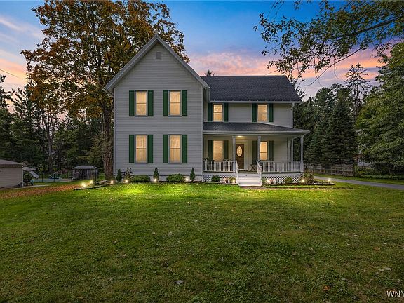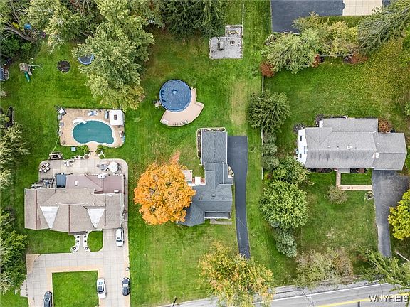Welcome to this charming Orchard Park home, set on a picturesque 0.81 acre lot, just outside of the Village. Formerly the Old Henning Farm House, this property features a welcoming front porch, vinyl siding and a stunning eat-in kitchen with stainless steel appliances, subway tile backsplash, white cabinetry, luxury vinyl flooring & walk-in pantry. Entertain in the formal dining room with gleaming hardwood floors and French doors that lead to a cozy living room. The large family room boasts an electric fireplace, perfect for relaxing evenings. A versatile 1st floor bedroom (currently used as a gym) includes sliding doors to backyard & attached half bath. Additional full bath, coat closet, & 2.5 car garage w/epoxy floor on main level. Upstairs offers 3 spacious bedrooms, including a primary w/11x14 walk-in closet room. Large full bath w/jetted tub, separate shower, double vanity, makeup area & laundry space. Enjoy the summers in the 27x52 above-ground pool w/deck (2024). Paver patio w/ fire pit perfect for entertaining. Recent basement updates include new poured floor concrete.