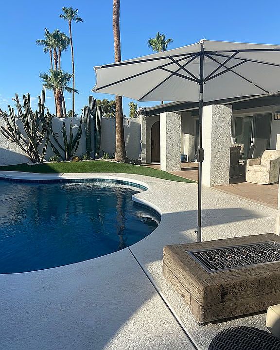This resort-style oasis in Scottsdale has 4 bedrooms and 2 bathrooms! The newly updated home with sleek finishes and designs features stainless steel appliances, ceiling wood beams, a fireplace, and an office. This house is the perfect desert paradise with a beautiful pool and covered patio, including plenty of space for entertaining. Schedule your showing today, as this home won't last long.