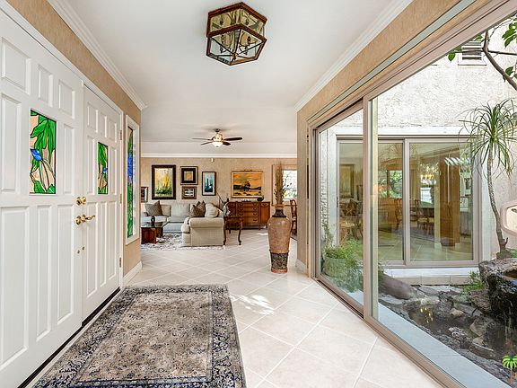 Reduced $50,0900 !S Palm Desert Single Family Home with VIEWS!~Location is Key~Leaded Glass Double Door Entry~Interior Atrium W/ WaterFall W/Extra Light and Air Flow~Large Living Room W/ Semi-Formal Dining Area~Up-Graded Island Kitchen adjoins Family Room W/ Fireplace~Master Suite and Bath adjoins Pool/Spa Area with Mountain Views~ Designed as Three Bedrooms ~ Modified to Two Bedrooms Plus Double Door Office W/ Bay Windows~(Closet could be added)~Oversize Private Pool & Raised Spa ~ Welcoming Curb Appeal ~ Up~Grades Abound ~ Granite CounterTops ~ All New Energy Efficient Double Pane Windows ~ Stained Glass Windows ~ Crown Molding ~ Newer Ceramic Tile Flooring ~ UP~Graded Lighting ~ The Western Mountain views are spectacular ~ The low HOA fees, currently $120 per month, INCLUDES CABLE TV, large association pool, spa and tennis courts. Enjoy the best combination of location, location, location and a stylish, elegant, yet comfortable So. Palm Desert home ~ EZ Show ~ Call today
