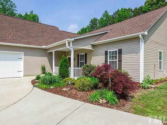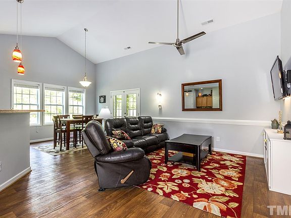 Thoughtful features abound in this charming home! Outdoor living rules w/landscaped entry, cozy screened porch, custom deck, & fenced garden. Keep yard tools & toys in the huge out-building. Inside this gorgeous open-plan home find upgraded floors, vaulted ceilings, chic lighting, built in entertainment center & desk, & finished garage storage. Living is easy in this "ranch"-only finished bonus room & unfin. walk-in attic are up. Fridge & W/D negotiable. No city/town taxes & just 25 mins from DT Raleigh!!
