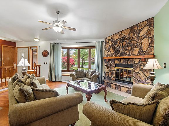 Only a job transfer makes this home available! Tour this custom built beauty set on a luscious corner lot. You'll enjoy the open concept layout with high ceilings, a natural stone-front fireplace, granite countertops in the kitchen, a huge pantry, and all brand new Stainless Steel appliances. Gleaming hardwood floors run throughout most of the home, with tile flooring in the kitchen, main bathroom, and laundry room. There are ceiling fans in most rooms, and lots of light shines through the new living room bay window. The two separate sliding back doors lead to the back patio that has a retractable awning, and the lovely yard with a garden. The huge basement is ready for your ideas! In a quiet and convenient neighborhood, and a Home warranty that's included, what's not to love?