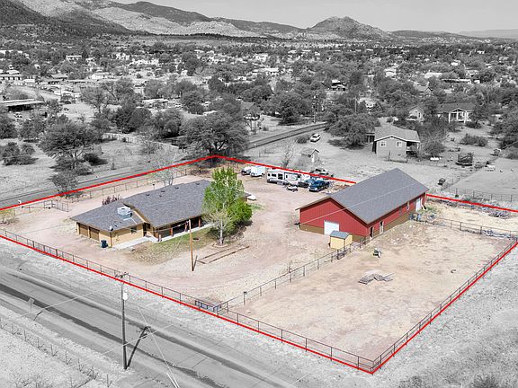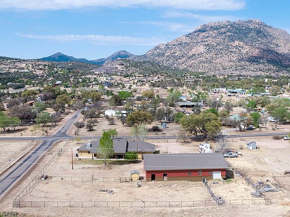 One level upscale rustic ranch home with 3200 SF garage barn and big views for sale in Williamson Valley, Prescott, AZ. The 40 x 80 foot garage has concrete floor for guest house, cars, workshop, RV, hay, tack, tractor. Level 1.2 acres with pipe rail and no-climb fencing for horses & farm animals. Open concept living with large great room, country kitchen with custom concrete counters, hickory cabinets, hand-scraped hardwood floors. Four bedrooms, three baths with custom cabinetry and granite counters in baths, handy laundry/mud room leads to attached 2 car garage. Granite Mountain views from the covered front porch. Ride, hike, bike to National Forest. Easy drive to public and charter schools, Yavapai Regional Medical, downtown Prescott. Assumable VA loan with excellent terms.