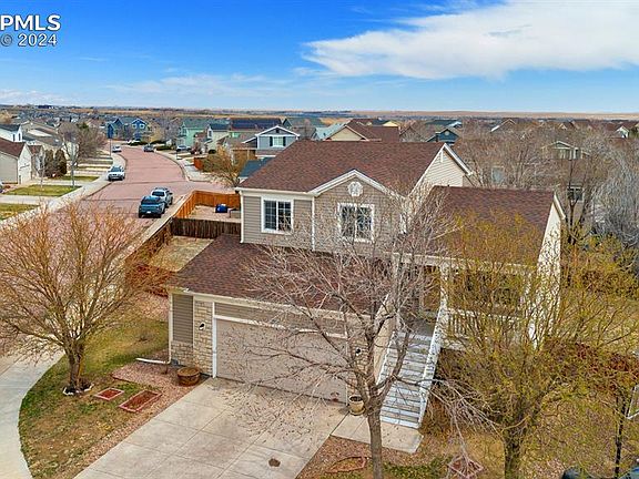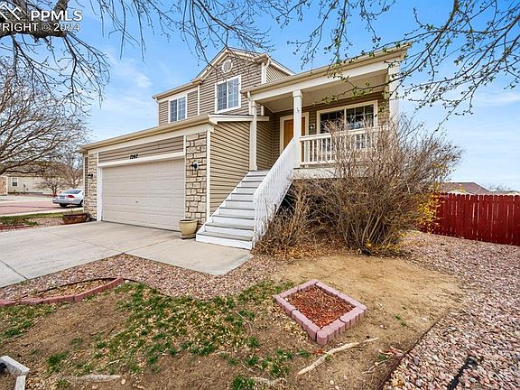 This charming home boasts a coveted corner lot position on a cul de sac, featuring a split level floor plan with separate living spaces and basement level additional flex space fully finished to be used as a bedroom area, theater room or office area. This floorplan is wonderful for anyone who needs multiple spaces. This home will have Brand New carpet fully installed by seller prior to closing for your buyers convenience. Notice the open kitchen with all appliances including refrigerator, hardwood floors and walk in pantry conveniently located just off of the inviting dining room. Step down to the lower level from the dining room into the family room area with walkout to the expansive corner back yard, perfect for entertaining or enjoying the outdoors. With three bedrooms and three baths, including a primary suite with ensuite bath, there's ample room for comfort. The basement level offers a full living room/flex space that could be used as a 4th bedroom, office/sitting area or even family theater room. Enjoy the convenience of central air conditioning, sprinkler system, and water softener to protect the plumbing system from hard water build up. Situated in a desirable location near parks, schools, shopping centers, Ft. Carson, and Schriever AFB, this community has a lot to offer including community gardens and a BMX track riding area. Revel in the stunning mountain views off the front porch, sitting room and secondary bedrooms, and the proximity to hiking trails and the Fire Station. With two garage spaces this property is a perfect blend of style, functionality, and convenience. Come view this house today and make it your new home.