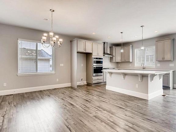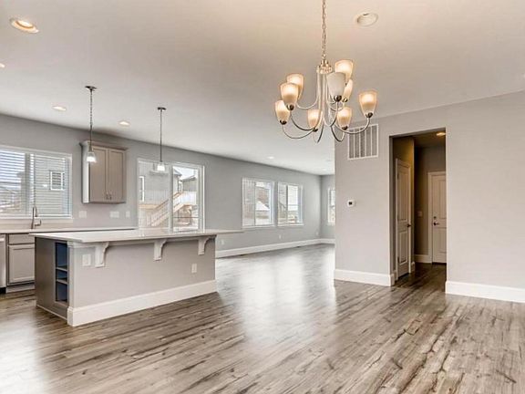 This Brand New Ranch Style home includes unfinished full basement. Large Great Room with 9' ceilings open to the kitchen which boasts 42" upper twilight cabinets with quartz tops, gas stainless range, pantry, large kitchen island with pendant lights. The owners suite includes 4 piece master with upgraded tile surrounds and euro framless glass shower door, upgraded laminate flooring, patio off the Dining room, A/C, Window treatments. Located in the Cherry Creek School District.