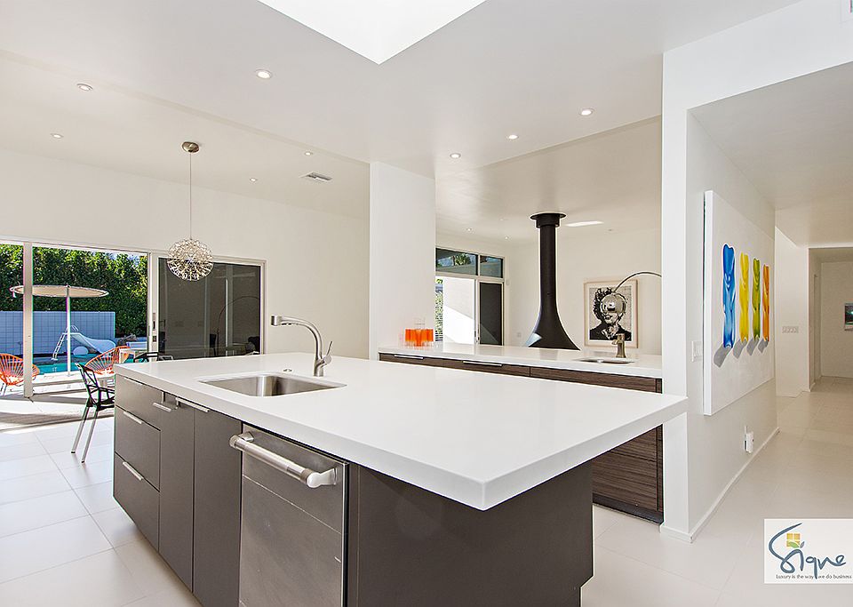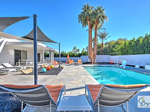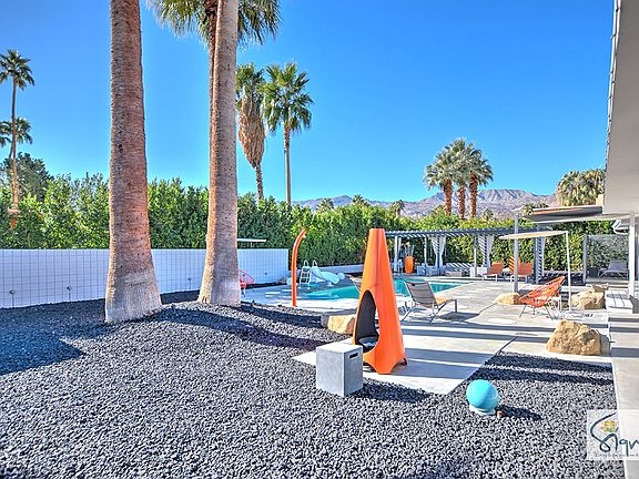 Meticulously remodeled, this modern, mid-century inspired stunner will take your breath away. The first impression is bold, with concrete walkway and modern desert landscaping. Beyond the double door entrance and foyer you will find an open concept living space overlooking the resort-like outdoor space, complete with pool & mountain views. The sunken living room features a mid-century inspired fireplace. The kitchen and dining area features quartz counters, custom cabinetry, and large central island. This home has large white porcelain floor tile throughout. Bedrooms are spacious with ample closet space. 3 bedrooms are en-suite with stunning tile showers, and 1 features an office area with views. The 4th bedroom has an adjacent full bath that also functions as a powder room. The garage has A/C and is wired for electric car charging. Located in a beautiful S. Palm Desert, this property is a must see for those seeking high design and fine desert living without the HOA's.
