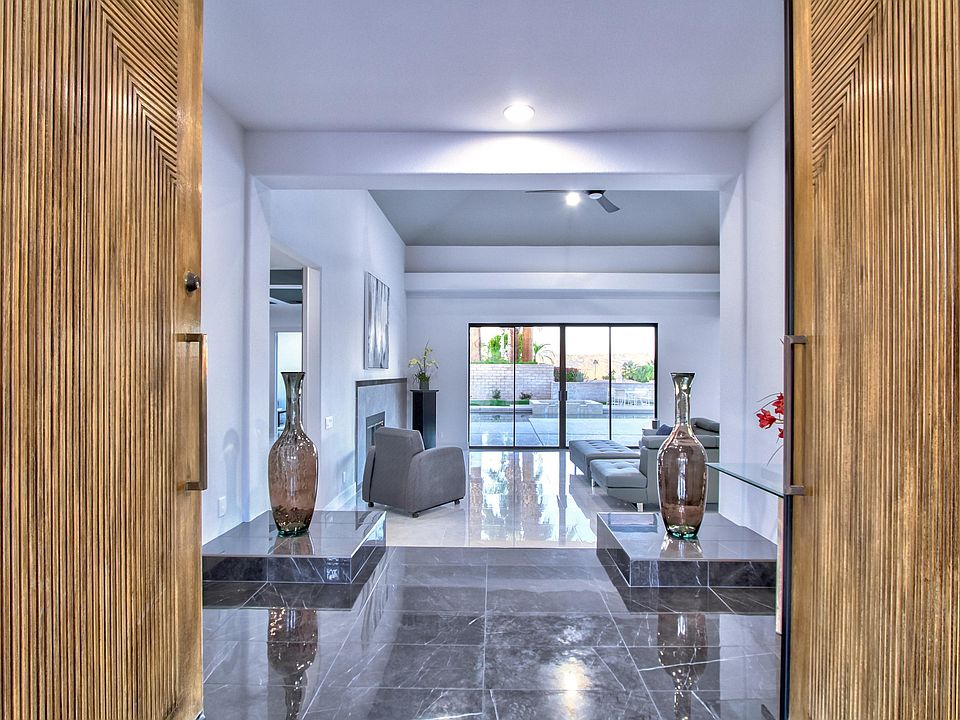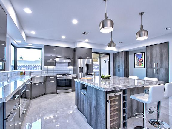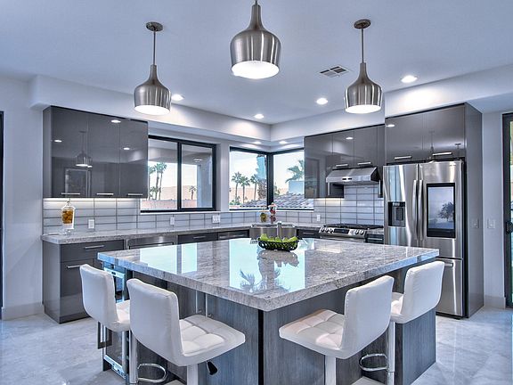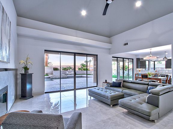 Stunning, Fully Remodeled Home Located at the Top of Highly Desirable South Palm Desert. This home sits on a premier, elevated lot with breathtaking views of the surrounding mountains, valley floor and sparkling city lights. Upon entering through custom double doors you will be awestruck by the beauty of the view the ambience of the interior. With shining porcelain 24x48 tile floors throughout, high ceilings and ultra modern kitchen featuring smart appliances, dual sinks, dual pantries, sleek granite counters, generous island with seating, built in wine cooler and built in beverage cooler there are magnificent views from every window. Over 3200 sq ft, 3 bedrooms, 3.5 baths setup with dual masters, all with en suite, and custom glass interior doors. Bathrooms look like a work of art with custom vanities, striking granite counters and modern lighted mirrors. Separate laundry room with brand new washer and dryer included. Sizable family room with 1/2 bath and direct access to the pool. 2 gas fireplaces. 3 new a/c units with 10 year warranties, 3 new hot water heaters, with 6 year warranties. Walls of glass with 6 sliding glass doors leading outside facing the pool and views. Covered patio, low maintenance landscaping, new synthetic grass, pebble tech pool, raised spa and outdoor shower. Large 2 car garage plus separate golf cart entrance. Owned solar system installed in 2019. Low HOA dues of $105 per month includes cable/internet. Come live the California dream today!