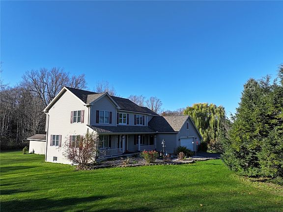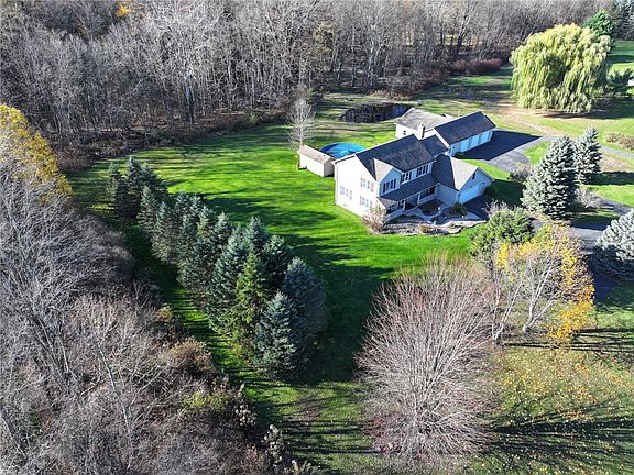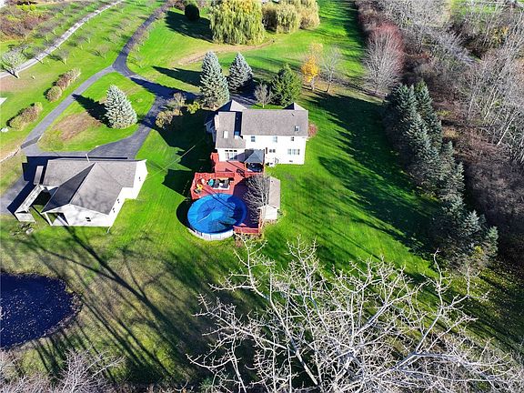 PRIVACY AT LAST !!! Setting way back off the road !! Stunning 2500+ sf 4 bedroom 2.5 bath Colonial on 5 GORGEOUS ACRES with a private pond! Attached 2 car garage and a HUGE out building / workshop with 4 overhead doors that will accommodate another 6+ cars ! Covered rear patio ! The home was built with quality appointments and excellent craftmanship! GREAT ROOM w/ soaring ceilings, skylights, LVP floors and floor to ceiling brick fireplace ! Full wall of windows with transoms above ! Grand 2 story foyer with turned oak staircase & tile flooring ! Wonderful cherry kitchen w/ an abundance of cabinets! Island breakfast bar , granite countertops, pantry & eating area w/ sliding door leading to your own resort ! Large 2 tier deck with cabana leads to the sparkling pool, and pool house w/ TIKI BAR, Kitchenette & Half Bath! Watch the deer sip from your private pond! Family room w/ gleaming oak floors features a 2nd eating area and living space! 1st floor office with full wall of built in bookcases could be a 5th bedroom ! Amazing main bedroom suite with sitting area, huge walk in closet with custom built ins, shoe racks and center island! New Bath with glass enclosed tile shower! Full basement with large recreation area and 2 more bedrooms! All this and more with lush landscape! Paved driveway with circle turn around and parking areas!