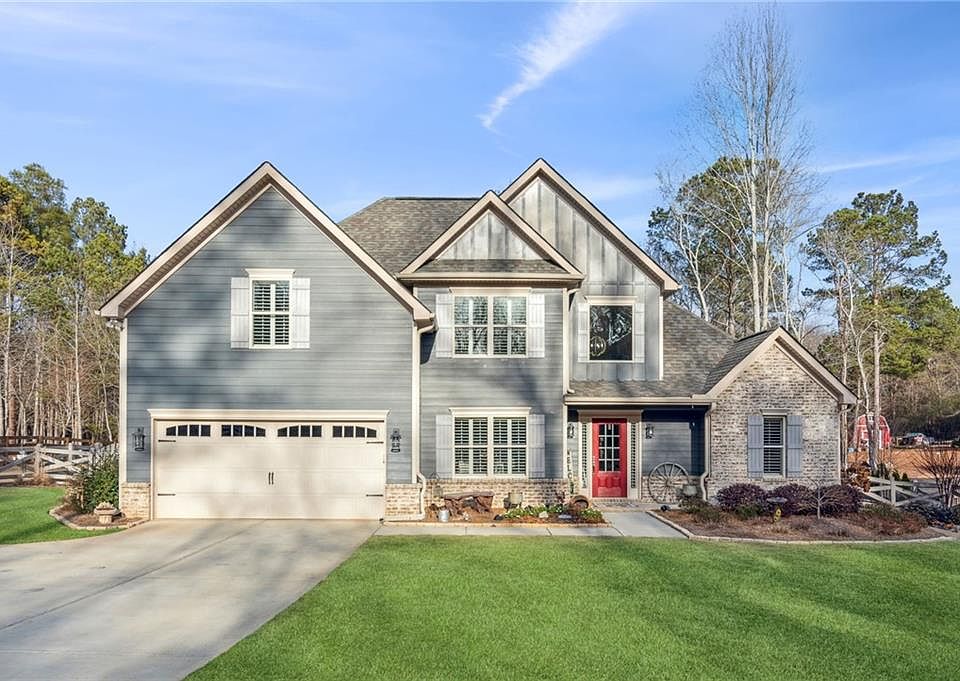 Welcome home to this stunning 2-story with master on the main floor situated on nearly 2 acres with no subdivision and NO HOA! When entering the front door you will be amazed by the 2-story vaulted foyer and great room. Throughout the main level you will find upgraded LVP flooring and ceramic tile in the kitchen and keeping room. The large separate dining room is great for entertaing dinner guests or could be converted to an office or playroom. The kitchen boasts granite countertops and stainless steel appliances and opens to a keeping room with fireplace and breakfast area. The master bedroom is conveniently located on the main level and leads into the master bath with double vanities and a separate tub and shower. Upstairs you'll find 3 spacious secondary bedrooms and another full bath, great for a large family or accomodating family in from out of town. Each window in this home offers elegant plantation shutters. The large level lot has been professionally landscaped and meticulously maintained with fenced backyard. The large covered patio out back is great for grilling and entertaining. Cool off in the oversized above ground pool surrounded by a huge deck, perfect for summertime pool parties. The barn style shed in the backyard is great for extra storage or a workshop. This home has it all and is only 5 miles from I-85, Chateu Elan, and dining off Hwy 211. Schedule your tour today! No sign on property.