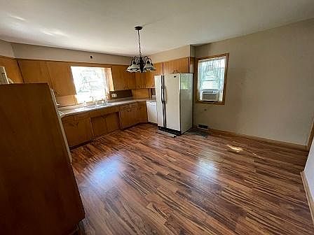 This four-bedroom home is only blocks from the new school, tennis courts, swimming pool and city park. Much of the house has hardwood floors that would look close to new if refinished. It is a one owner home that was built by the owners, so corners were not cut. It has two detached garages, one with a wood burning stove. The two bedrooms upstairs are very large and have an attached 1/2 bath connecting them. Half the basement was finished at one time, has a fireplace and could again make a nice family room. Make it your own with a little updating and paint.