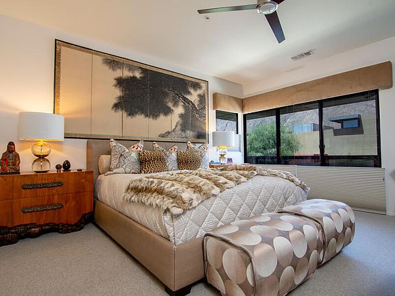 Quality and pride of ownership best describe this beautifully enhanced home in 48 @ Arenas. Enjoy the convenience of downtown PS walkability and the benefit of owning the land (FEE land). From the moment you step inside, this impeccable home will captivate you. The private front patio offers a cozy outdoor space for you and your pets. Inside, be welcomed by custom designer upgrades, open concept living/dining areas that seamlessly integrate with the gourmet kitchen, showcasing newer cabinetry and quartz counter tops, plus high-end integrated appliances, and efficient LED lighting throughout. The gorgeous solid oak tread staircase leads to two spacious primary suites, each featuring upgraded bathrooms, and nice separation to maximize privacy. The west primary suite boasts lovely views of the San Jacinto mountains, enhanced by top-down bottom-up shades and sliders to a Juliet balcony. The second primary suite to the East is beautifully upgraded with custom wallpaper and includes a sitting area plus desk space. Additional conveniences include a full-size stackable laundry off the kitchen and direct access to the designated single covered carport. The private and gated community of 48 @ Arenas offers 4 pools and spas, gated entry, and close proximity to downtown PS attractions. See ''Documents'' for a list of Seller Improvements. This is a home you won't want to miss!