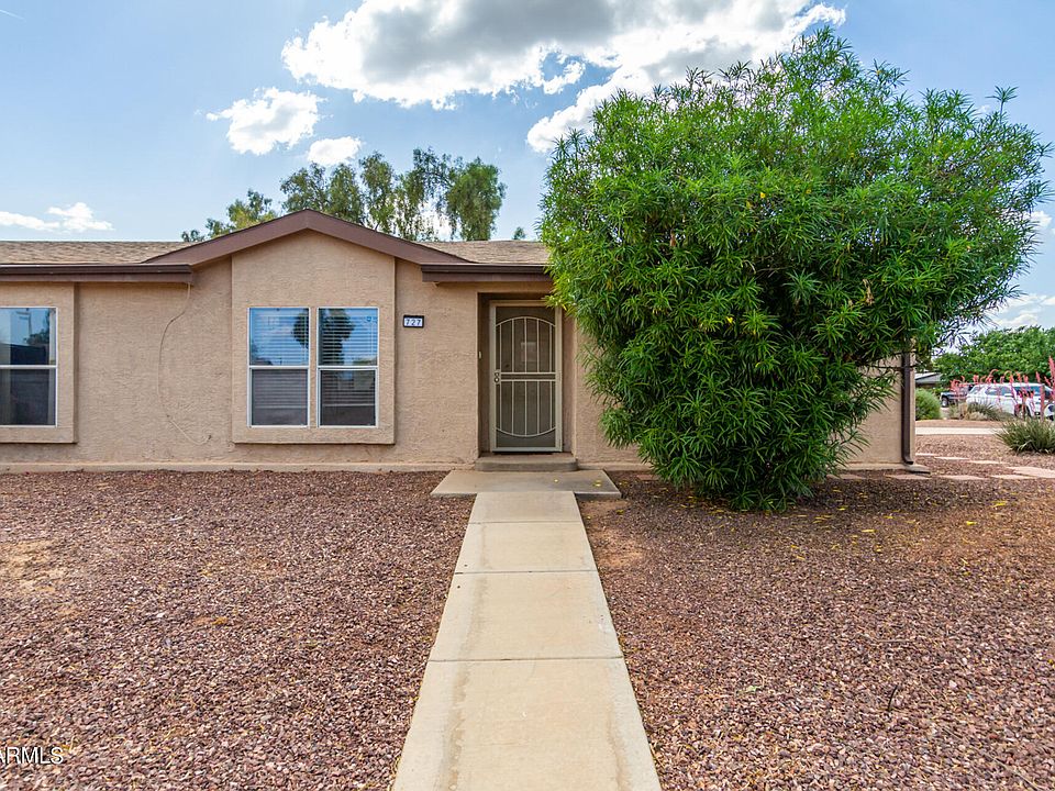 Charming 3 bedroom, 2 bath home, plus a convenient den/flex room, on a desirable corner lot is now available in the welcoming Estrellas Garden Subdivision. Once inside, appreciate the split open concept floor plan featuring vaulted ceilings and a spacious family room that flows effortlessly into the eat-in kitchen. Here you will find updated cabinetry with stylish pulls, ample countertop space, SS appliances: gas cooktop range/oven, dishwasher, refrigerator, along with a wonderful dining area. Step on through and you have great access to the fantastic backyard offering an extended covered patio, low maintenance synthetic grass, and plenty of space to create your own backyard oasis. Back inside, make your way to the primary bedroom highlighting an ensuite bathroom showcasing an updated walk-in shower with decorative tile border and a large walk-in closet. The two secondary bedrooms, convenient den/flex area, and a spacious laundry room, that includes the washer and dryer, round out this incredible floor plan, so be sure to take a look and start imagining the possibilities. This modular home is affixed with a nice stucco finish and is desirably located close to a neighborhood park, nearby schools, and has easy access to SR-85 for commuting.