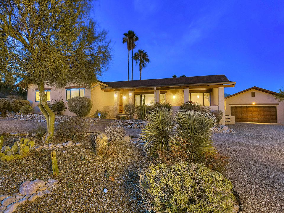 Secluded foothills home on an acre + lot with great mountain views and city views from the front porch! District 16 schools. Newly renovated features throughout the house including gourmet kitchen complete with tastefully appointed cabinets, double ovens, vents and granite countertops; travertine bathrooms; new tile/carpet flooring; all the windows and sliding doors. Also a living quarter (with permit) adjacent to the oversized detached two-car garage. New water heater and two AC units. Large backyard complete with over-sized pool, maintenance-free lawn, landscape with palm trees, and newly renovated sports court. Resurfaced and fully landscaped circular driveway with a newly installed dramatic front door in the front offers great curb appeal, with plenty of room for guest or RV parking to the side.