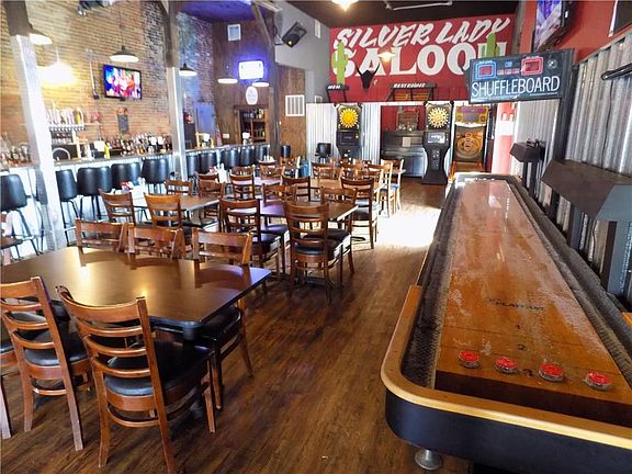 Great opportunity for a turn key business & building! Currently used as The Silver Lady Saloon. Comes lock, stock & barrel with everything you need to start making money on day 1 including a 3 way liquor license & gaming license, 3 POS systems, all inventory, TV's, cameras, signs, etc. 3 large walk-in coolers, 10x16 liquor room, large kitchen area with appliances to remain, 30x40 gaming room with 3 pool tables, 27x58 dining/bar area with several tables, chairs & bar-stools included, 10x11 pantry room with 7x10 office area. Upstairs has an extra 38x42 rec area with refinished flooring that could easily be converted to an apartment for living quarters or additional income! Newer furnace & water heaters. Lots of potential with this one!!