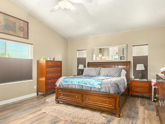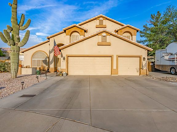 The possibilities are endless with this well maintained 5 bed/3 bath home. Perfectly situated on an oversized cul-de-sac lot with No HOA! With almost 1/3 acre, this home features plenty of parking and storage for all your toys! RV gate, 2 storage sheds with 30amp hook up and 220. New lattice cover next to the pool and ficus trees for privacy. New windows, blinds, newer A/C's, water softener, security cameras, a Must See.