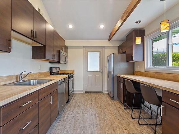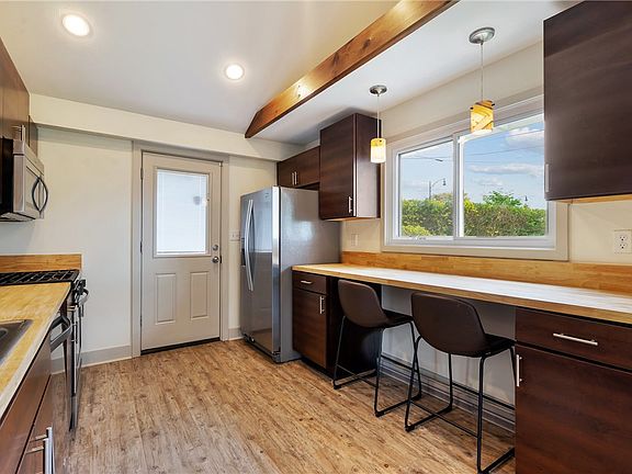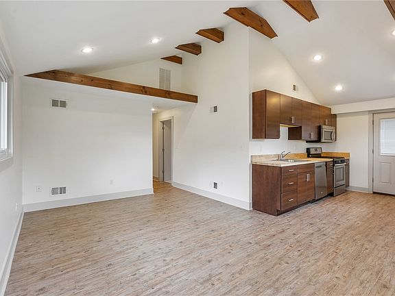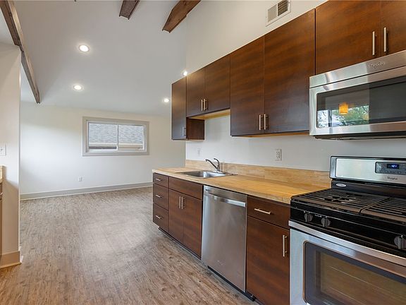 Must see this modern updated 2 bed, 1 bath ranch in Garfield. Enter into a stunning living space with vaulted ceilings, exposed beams, and high-end finishes throughout. Open kitchen boasts modern fixtures, stainless appliances and great natural light. Luxury vinyl flooring in all living spaces. Two generous bedrooms are newly carpeted with ample closet space. Recent updates include fresh paint, new carpet, new counters, and much more. Huge back patio is perfect for entertaining with a stunning hilltop view. Sought after off street parking in the detached 2 car garage. Convenient location within minutes to all the east end has to offer - nearby to major hospitals, Penn Ave, Lawrenceville, shopping, restaurants, parks and more.
