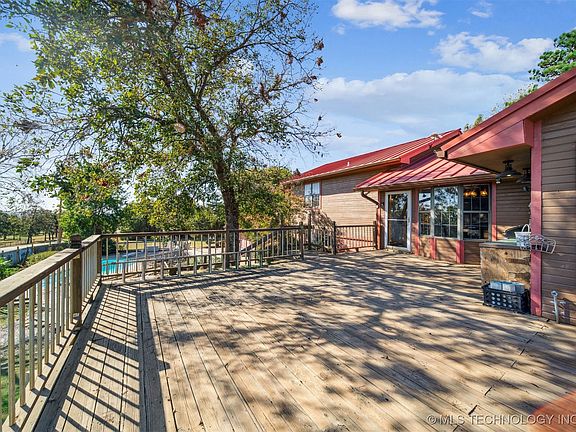Escape to lake living less than 30 minutes from Tulsa! This spacious home is surrounded by mature trees and offers plenty of room to relax and entertain. Enjoy peaceful views from the 2nd story deck, an inviting in-ground pool, and easy highway access for a quick commute. Inside, the home's classic style provides a warm, homey feel - ready for your personal touch. Whether you are looking for a weekend retreat or a year-round residence, this lake property has endless potential. Boat slip access about 3 miles away at Cow Skin Bay. The downstairs living area has a wet bar and additional oven. Detached 4 car garage deep enough to store 21 foot boat.