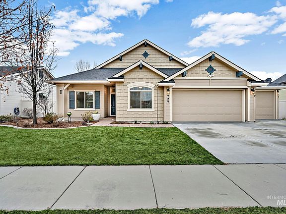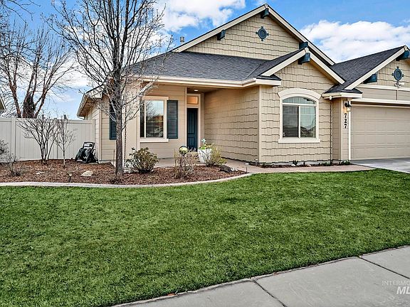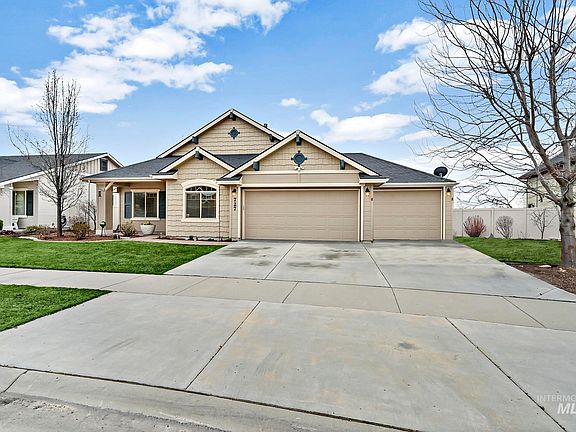You will love indoor & outdoor living in this beautiful Eagle home that overlooks a stunning pond situated on nearly a third of an acre. A custom pergola shades an expansive patio & deck, the ideal setting for private relaxation, entertaining, & spectacular sunsets. The mature landscaping features various fruit trees, grapevines, abundant flowers & garden boxes. Inside, the kitchen is a cook's dream, complete with a large walkin pantry, gas range, oak cabinets, granite countertops & a raised breakfast bar. Beautiful hardwood floors & vaulted ceilings extend throughout the main living area; the great room includes a gas fireplace, open shelving & the office/den with double french doors provides additional living space. You'll find all fresh interior paint in this split-bedroom layout, new carpeting, & a private master suite boasting his-and-hers walk-in closets. A large shed/shop & trailer parking offer ample storage. Walk to community pool & playground! Situated near the Greenbelt & Eagle Island State Park.